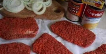 Ingredients: °6 steak cubes°1 onion, peeled & cut into rings°1 box cream chicken soup°1 can of cream of celery soup°1…