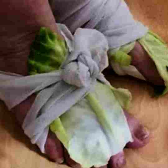 3.Apply to Affected Area: Place the cabbage leaves directly on the swollen joints or around the neck for thyroid concerns. You can slightly crush the leaves with your hands to release more juice if you like.