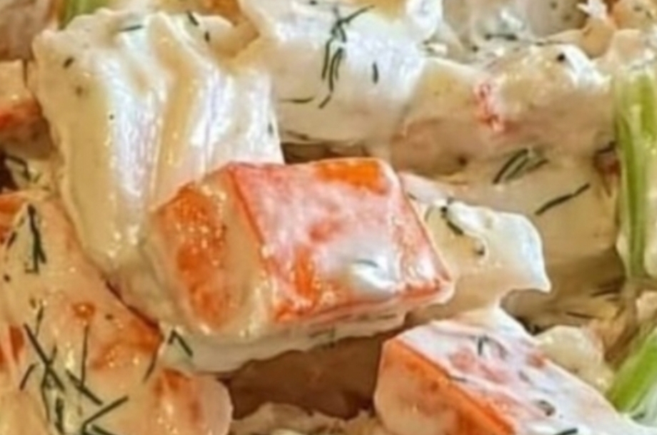 •Add the shredded crab meat, chopped celery, and green onions into the dressing. Toss gently until everything is evenly coated.