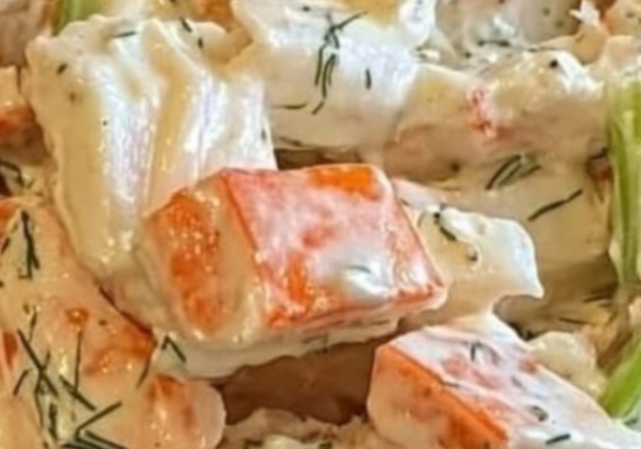 •Add the shredded crab meat, chopped celery, and green onions into the dressing. Toss gently until everything is evenly coated.