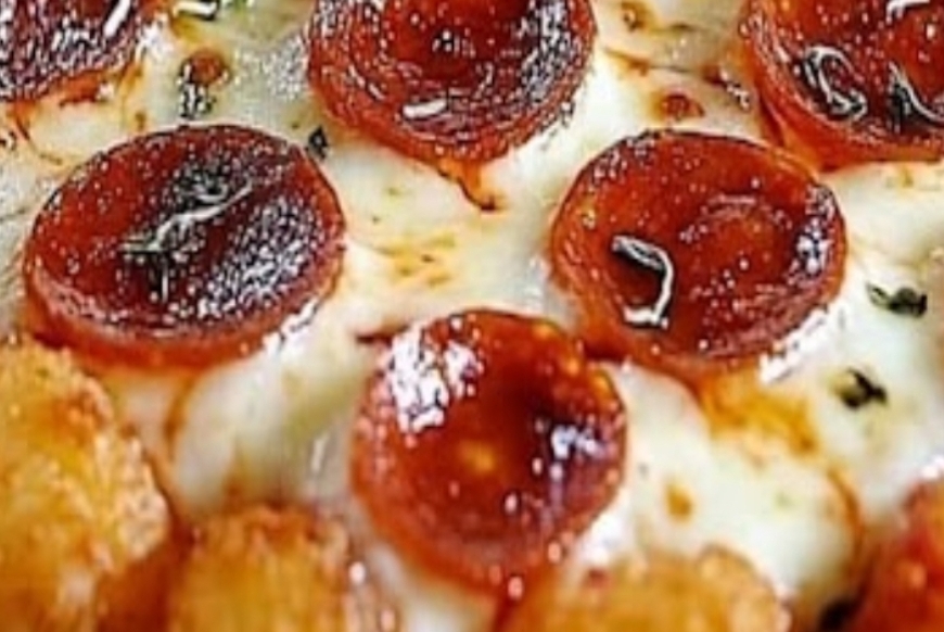 Remove the crust from the oven and spread the pizza sauce evenly over the tater tots.