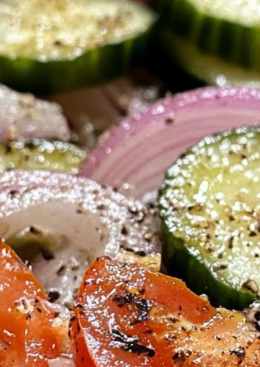 Prep your veggies: Slice cucumbers, halve tomatoes, and thinly slice the red onion.