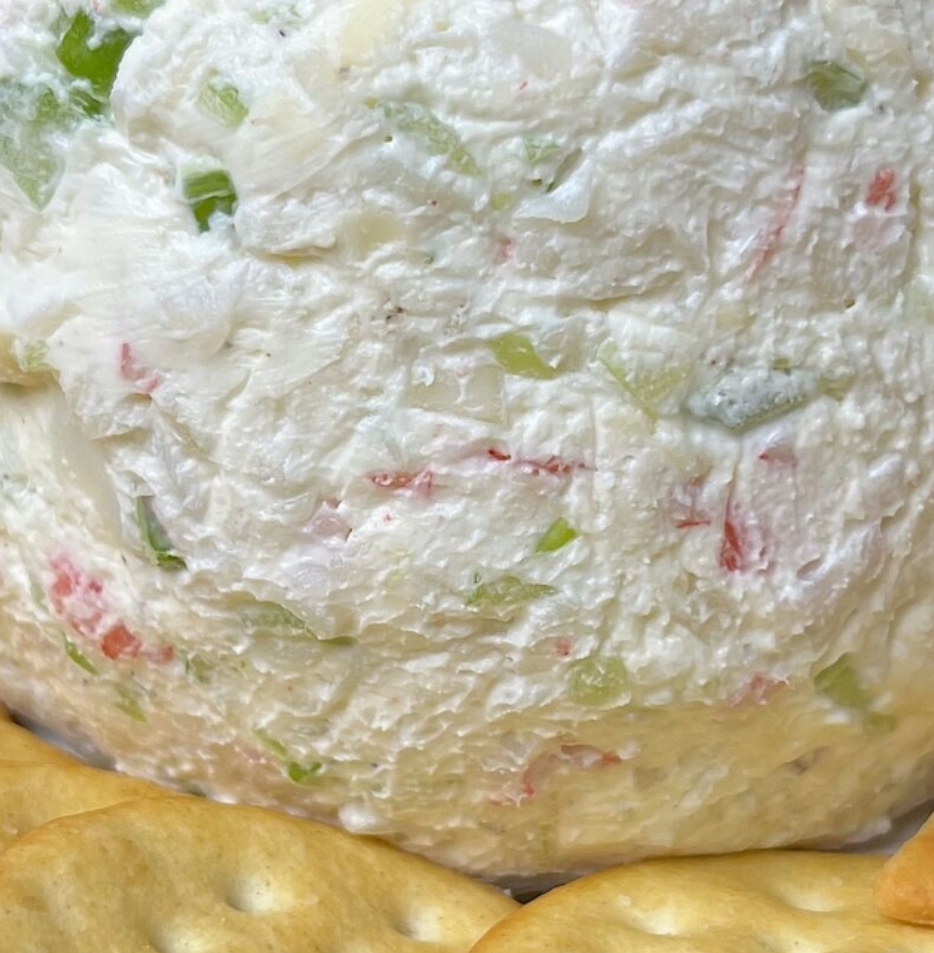 Serve: Unwrap the chilled crab cheese ball and place it on a serving plate. Serve with an assortment of crackers, pretzels, or fresh veggie sticks (like cucumber slices, carrot sticks, or bell pepper strips).