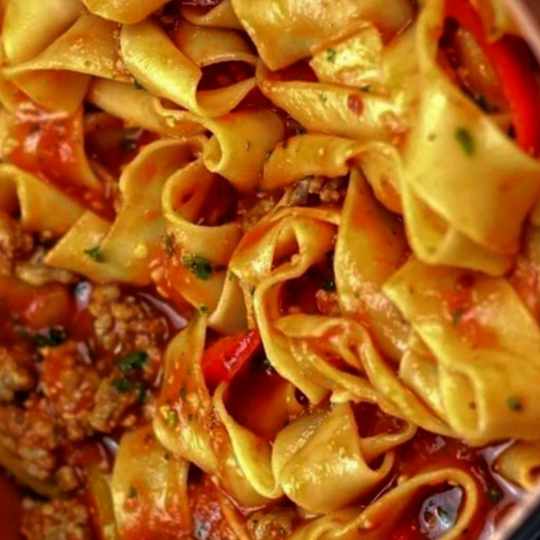 4. Add the diced tomatoes, Italian seasoning, red chili flakes, salt, pepper, and simmer for 10 minutes. Return the sausage to the pot and add the chopped parsley. Cook for 5 more minutes and keep warm while cooking the noodles according to package instructions. Drain the noodles and add them to the pot. Toss to combine and serve.