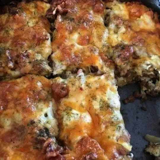 Channel and dispose of oil.Spread hamburger onto the lower part of a 9×13-inch dish container. Mix in bacon pieces.
