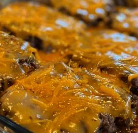 - Place the browned hamburger patties over the onions, then cover with the remaining potatoes and onions.
