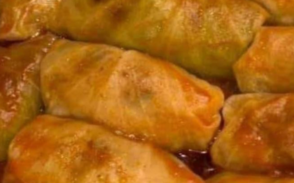 - Place some cabbage leaves on the bottom of a deep 9″ x 13″ baking dish or roasting pan. Taking one leaf at a time, distribute about ¼ cup of ground beef mixture on top and wrap up (fold in sides and roll up, placing in prepared dish, seam side down. Continue with remaining ground beef mixture/leaves.