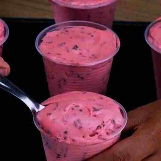 In a blender, add the cream, whipped cream, condensed milk, and strawberry juice and mix everything well. Don’t forget that you can choose a different flavor of juice if you prefer. Then add the colored balls and mix well.