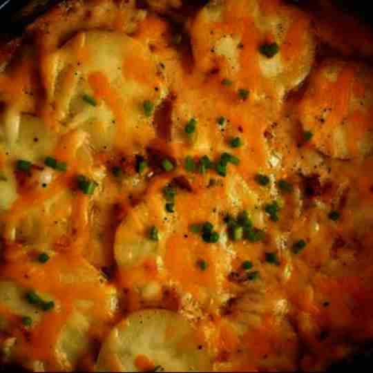 6. Place a lid on the pot and simmer at a low temperature for 5 to 6 hours, or at a high temperature for 2 to 3 hours. The cooking duration may vary based on the particular slow cooker you are using and the thickness of the potato slices.