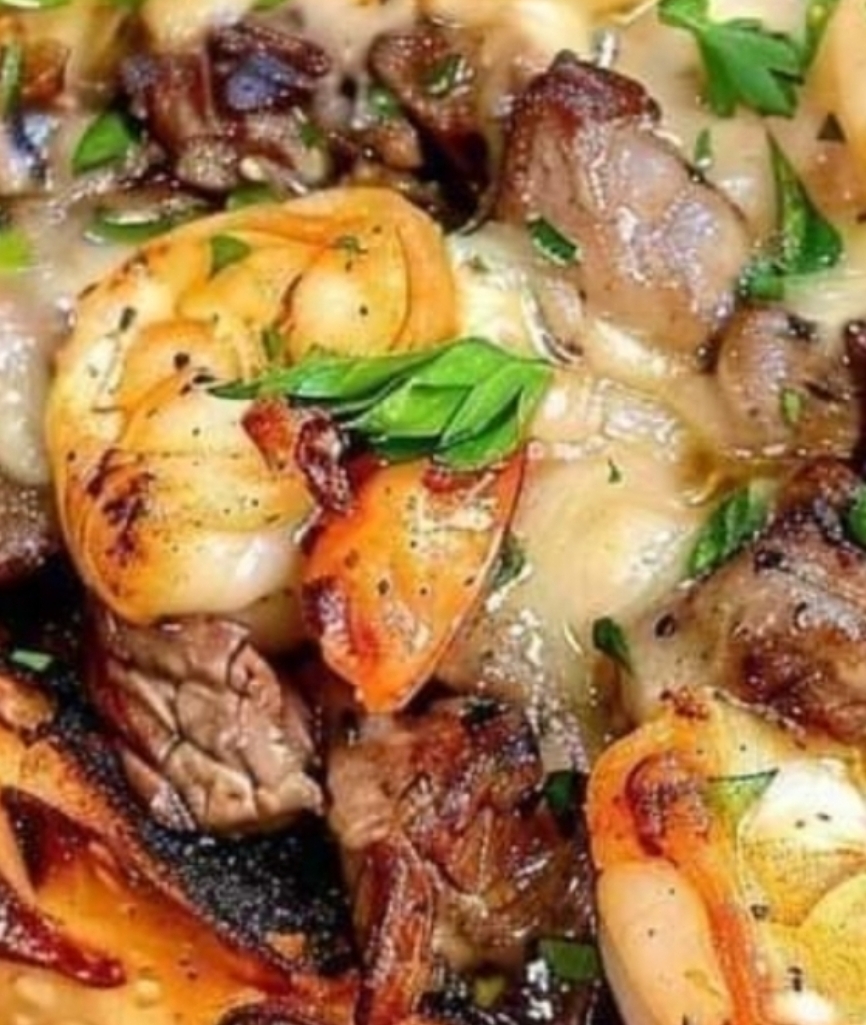 Preheat oven to 375°F (190°C). Hollow out the bread, fill with the steak and shrimp mixture. Place on a baking sheet.