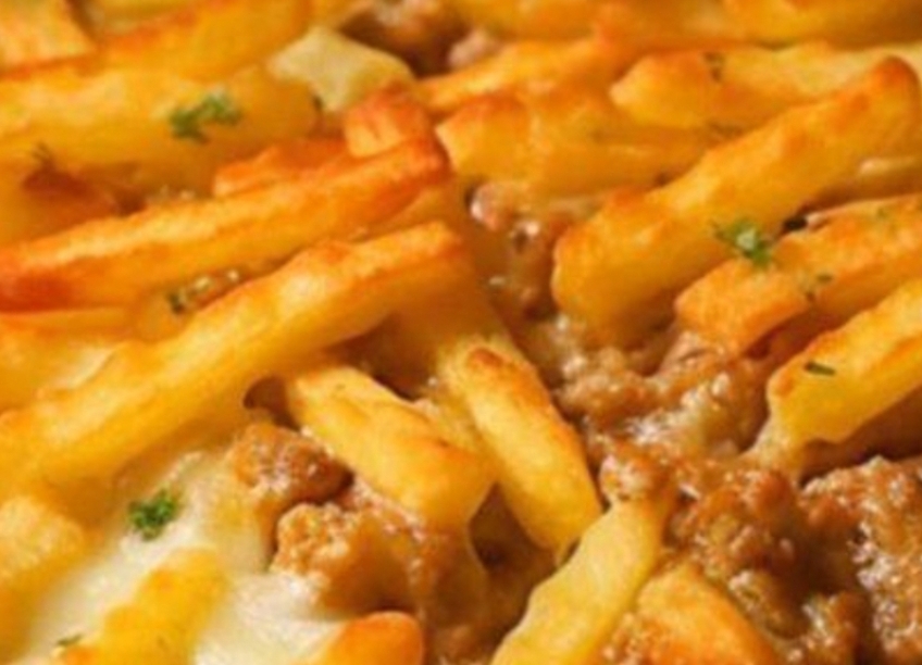 Place the casserole in the preheated oven and bake for about 35-40 minutes or until the French fries are golden brown and the filling is bubbling.