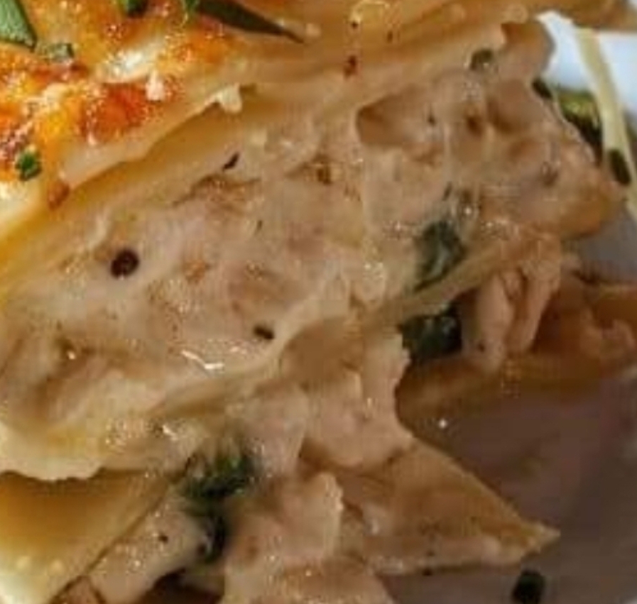 Eight to ten servings of a spring vegetable chicken Alfredo lasagna.