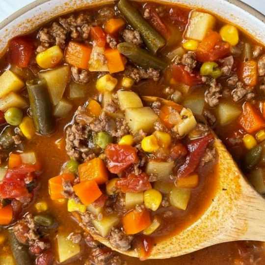 Stir the carrots celery and onions into the mince; Cook and stir until the vegetables are soft about 5 minutes. Add potatoes tomato sauce ground whole tomatoes non-rainy peas corn and green beans to the pot; Season with black pepper. Stir the mixture until evenly mixed. Adding thyme also bay leaf to the pot. Pour 1/4 cup of water over the mixture if necessary to moisturize the mixture renewing as needed during cooking.