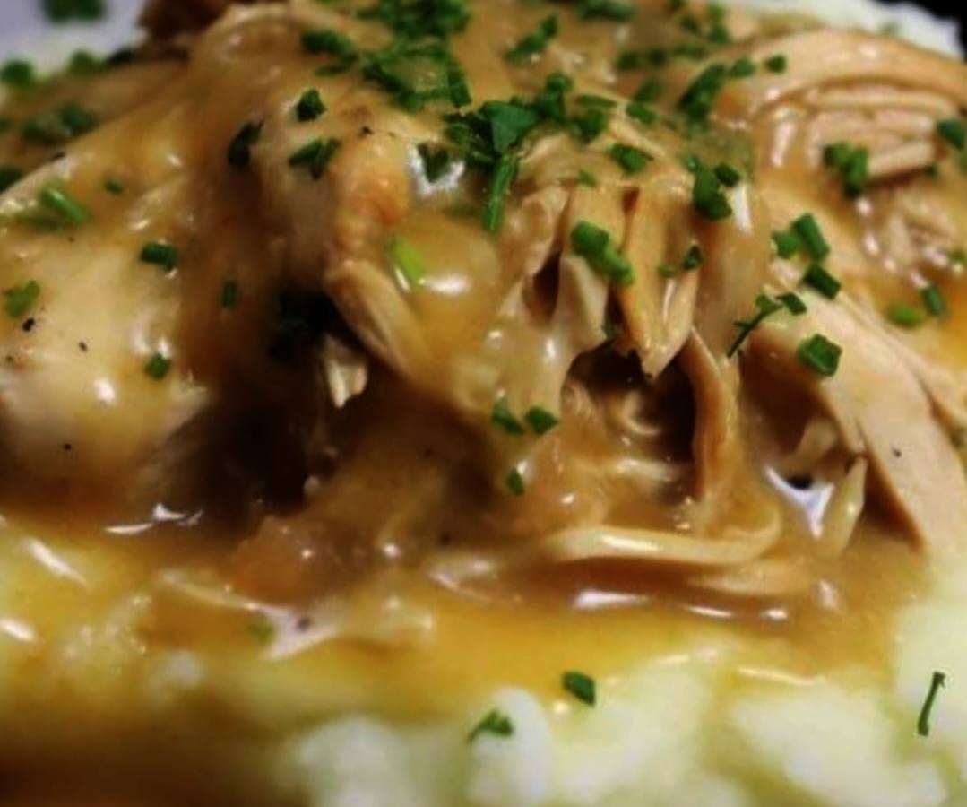 Simmer the chicken and gravy in a slow cooker and savor the flavors.